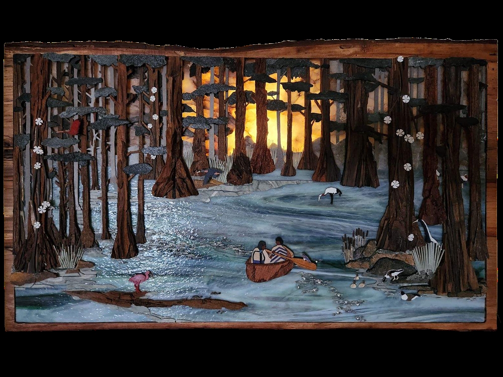 The peaceful world of ages past is captured in this Cypress swamp scene brought to life by the subtle interactions between light and stone, wood and glass. A forest of piece-by-piece constructed Pecky Cypress trees overlays a beautiful, shimmering stained-glass waterway in which a bright backlit sky made of translucent, golden quartzite allows the scene to showcase its ever changing light effect. Featuring two young Native American girls paddling through a forest populated with pieced, layered stone egrets, herons, ibis, ducks, and even a bluebird perched on an oar, with but a small spotlight shined through the bold quartzite sky, this incredibly dynamic piece will surprise as it radiates its beauty throughout the darkest room.