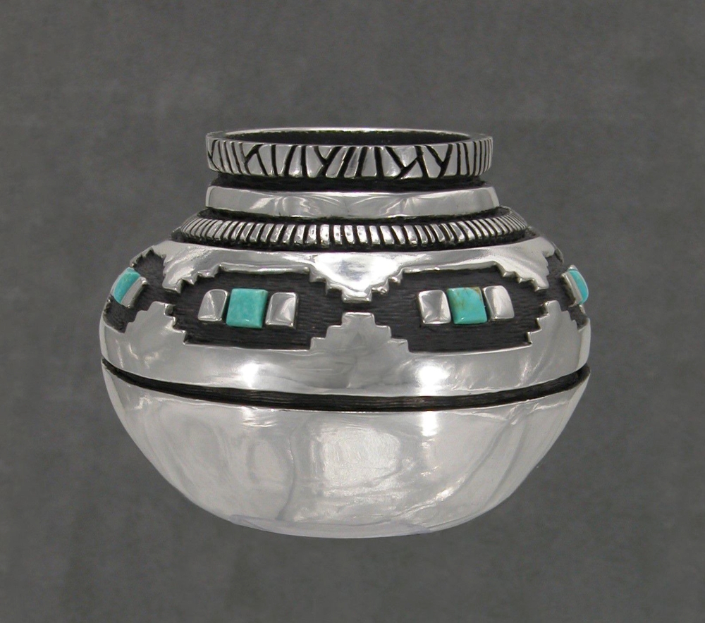Born and raised in the Southwest, Fred Ortiz sculpts unique bronzes. His work is a modern interpretation of traditional Native American pottery, and gives familiar forms a contemporary appeal. Ortiz begins by carefully selecting a piece of fine stone, and then designing the pot around the centerpiece of the stone. Each one of his bronze pots are original, one-of-a-kind sculptures. These highly collectible pots are treasured by bronze collectors around the world, including commissioned pieces created for the King of Jordan, the Sultan of Brunei, and the King of the United Arab Emirates.