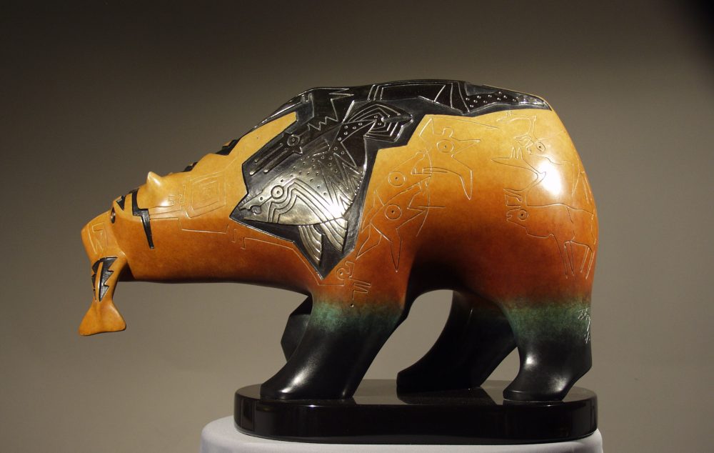 We covered the piece with sgraffito images of flying geese, caribou, and fish. Streaming back from the bear’s head is a life spiral, representing that continuity of life through time. The polished images on the bear’s back are a hand, representing the hand of man who has responsibility for the habitat of this magnificent animal, and above the hand is a ghost dancer.