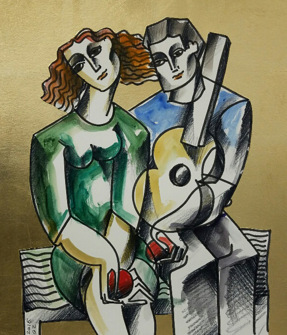 Collectors love Yuroz’s cubist style – so reminiscent of Picasso – as well as his recurrent themes of love and companionship. The artist’s own hardships only serve to make him more appreciative of the tender moments shared between friends and lovers. Drawing on his Armenian heritage, Yuroz incorporates the imagery of the pomegranate into his art, as well as other symbols, such as the blue rose, the book of poetry and the guitar without strings. Each element tells a part of the story, illuminating the nature of the relationship between the characters and what the future holds for them.