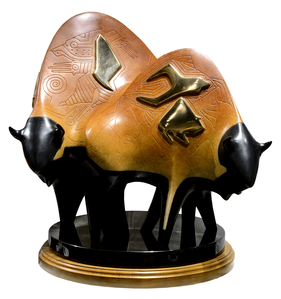“Written on the Wind” gets its title from a line in Larry McMurtry’s novel Lonesome Dove, which was one of our favorite unabridged books-on-tape. At one point in the novel, the hero, Gus, camps out on the Llano Estacado, a vast plain stretching from West Texas into eastern New Mexico. There he contemplates the silence of the plains at night, recalling that at one time, the plain was covered with a herd of buffalo so vast that it took a rider on horseback a day to travel around it. White men wiped out the buffalo herds, emptying the plains of everything except piles of bones bleaching in the sun. As Gus ponders the future, he speculates that one day the sounds of man will replace the silence. The history of the Llano Estacado was written on the wind, and we named our double buffalo bronze for that history.”