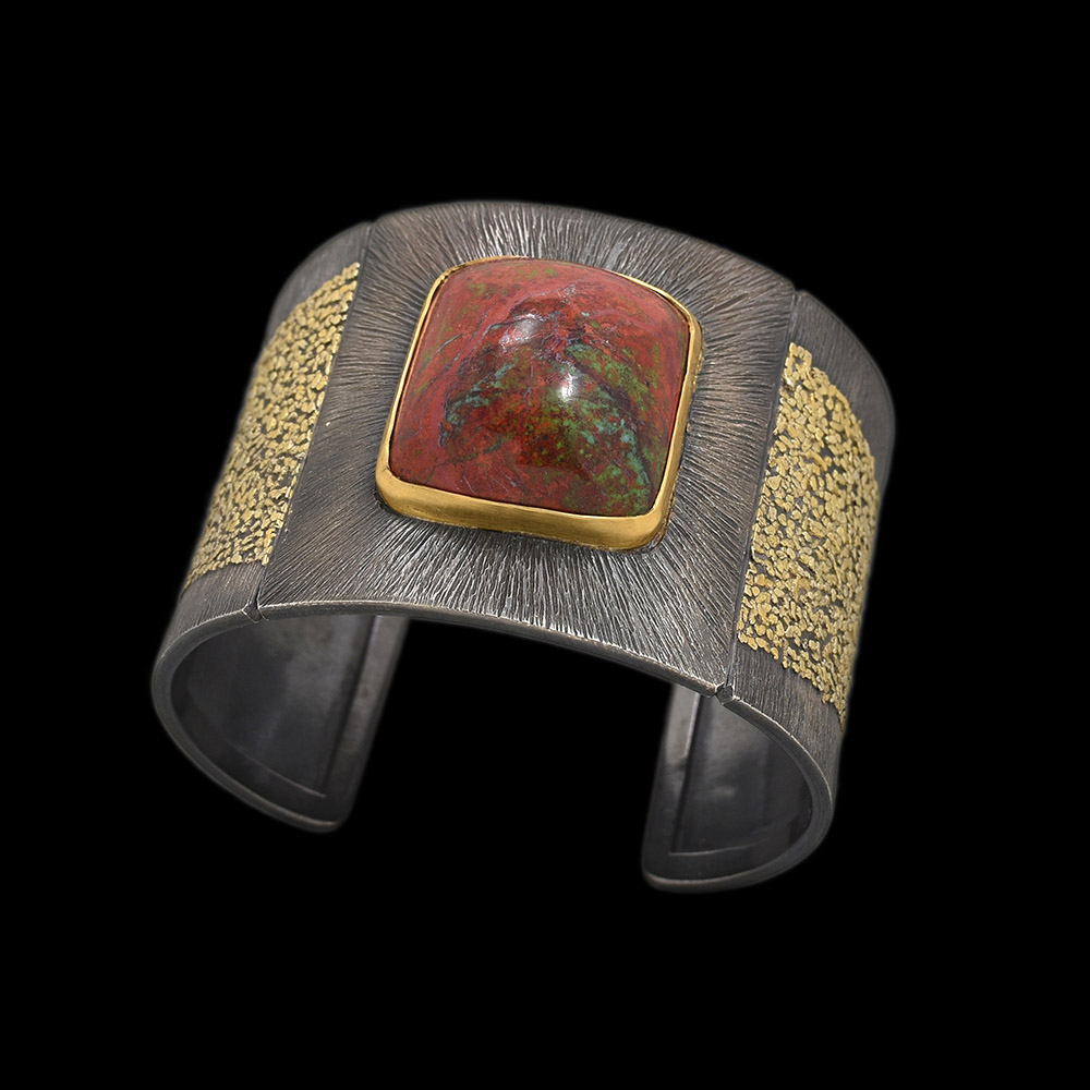 This One of a Kind Cuff is made with Cuprite that is bezeled by 22K Yellow Gold, The Cuff is also made with California Placer Yellow Gold and Oxidized Argentium Silver