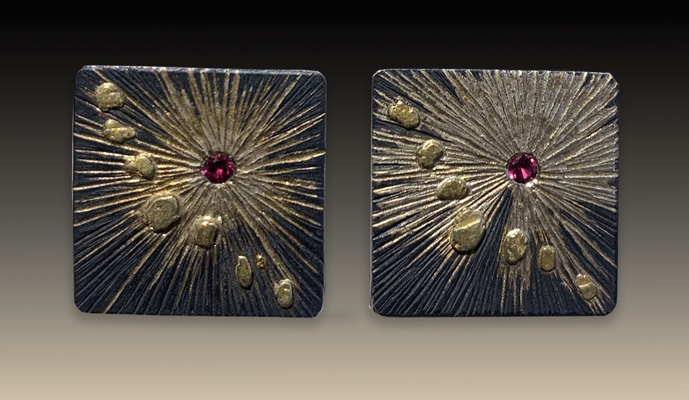 These One of a Kind Earrings are made with CA placer gold and 14k yellow gold fused to carved, engraved, oxidized and textured argentium silver.